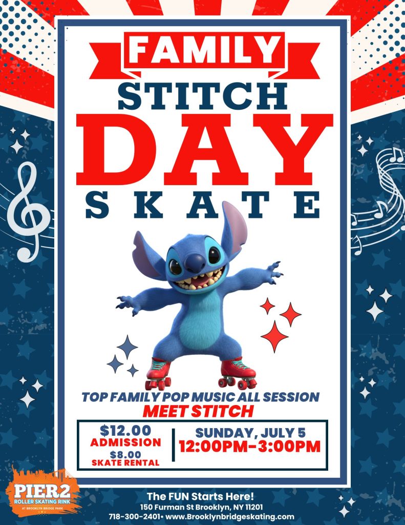 Join us Sunday, July 5th from 12 PM β 3 PM for top family pop hits, skating, photos, and an unforgettable meet & greet with Stitch!