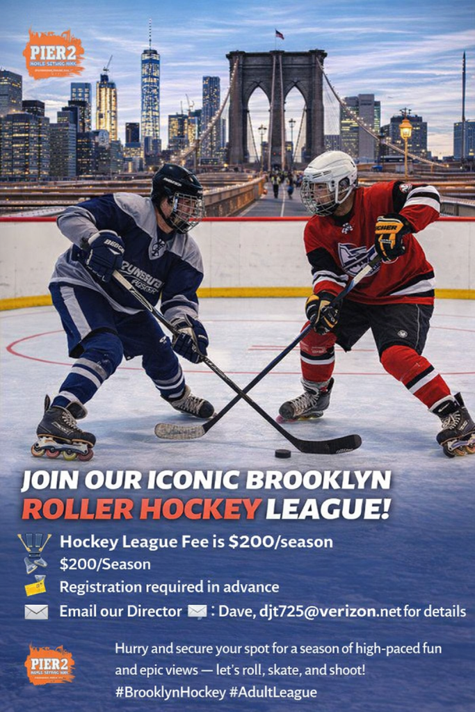 Join our seasonal adult hockey league and play hockey at the iconic roller rink in Brooklyn! Overlook The Brooklyn Bridge and the BEST views of NYC all while playing your favorite sport!
