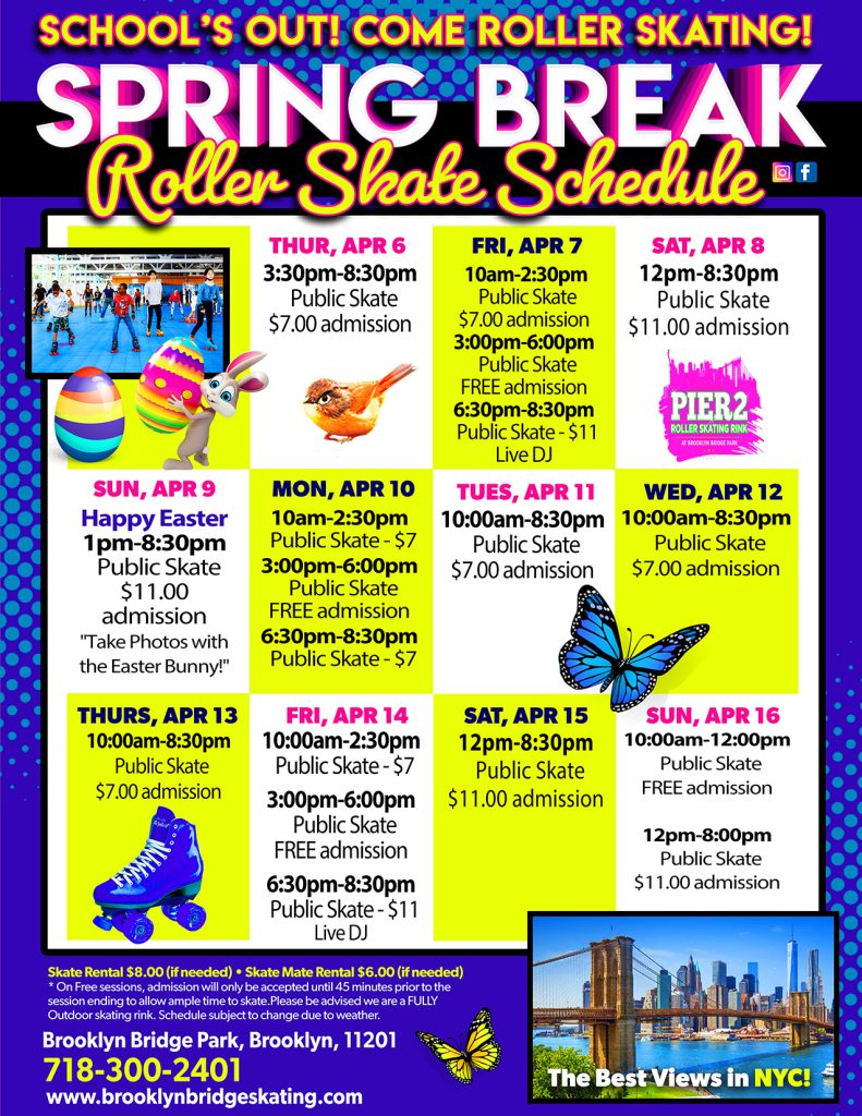 Spring Break Roller Skating is Thursday April 6th 2023 through Sunday, April 16th 2023.