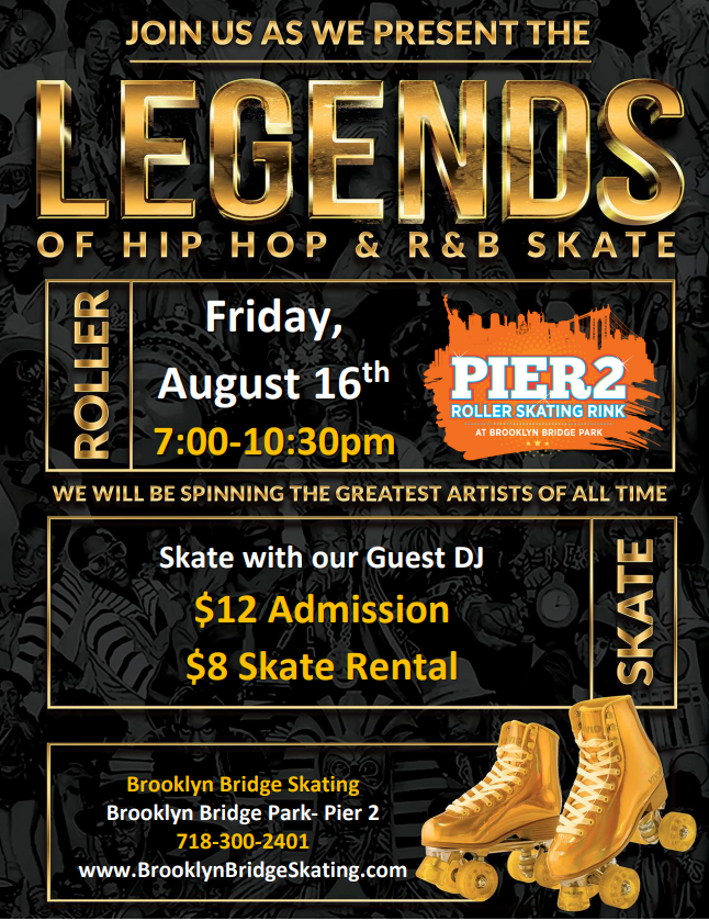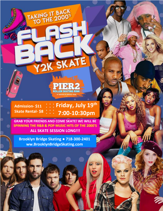 Brooklyn Bridge Park - Pier 2 150 Furman St, Pier 2, Brooklyn, NY, United StatesLoved all the hits from the 2000's? Join us on Friday from 7pm-10:30pm for a great night of roller skating. Our LIVE DJ will be playing 2000's music all night! Admission- $12 Skate Rental- $8 (if needed) Skatemate Rental- $7 (if needed) *Please be advised this event is open to all ages *No outside food/drinks […]