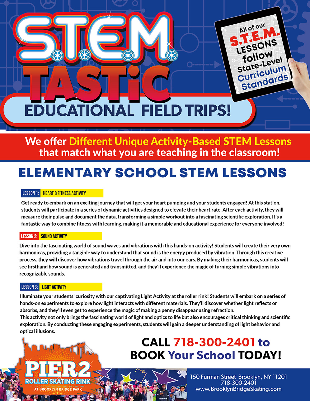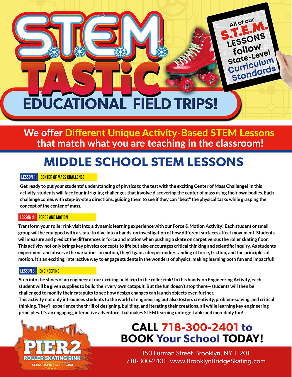 Introduce your students to a unique educational STEM field trip in Brooklyn, NY at Pier 2 Brooklyn Bridge Roller Skating that gets them excited about learning! Students will learn how the concepts of science, technology, engineering, and math can be found in everyday experiences, even fun experiences like roller skating!